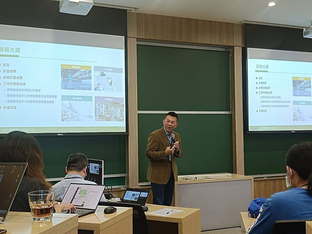漾拓國際總經理鄭加新參與環境部113年資源循環科技發展及創新研討會,發表計畫:「綠色設計低碳 LED 燈管暨租賃與維修循環經濟研發」,正式發表綠色設計可快速拆解維修高光效(180lm/w;比節能標章再省電15%)led燈管。